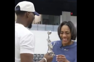 值得一提的是,WNBA總裁凱茜-恩格波特手持獎(jiǎng)杯,將其交給了阿德巴約。而阿德巴約也開(kāi)心地給女友頒發(fā)了獎(jiǎng)杯,阿賈流下了激動(dòng)的淚水。