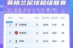體育資訊9月22日訊 阿森納vs曼城比賽結(jié)束,最新積分榜情況出爐。