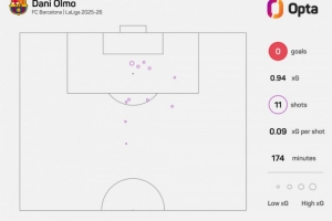 本賽季,奧爾莫在西甲中11腳射門均未能破門得分。在沒(méi)有取得進(jìn)球的球員中,僅伊納基-威廉姆斯和阿斯普里拉所用射門次數(shù)更多。