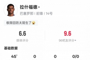 全文摘要:9月22日西甲第5輪,巴薩3-0勝赫塔費(fèi)。拉什福德替補(bǔ)登場(chǎng),2次射正全場(chǎng)最多,傳球成功率高達(dá)93.8%,但未能進(jìn)球或助攻。