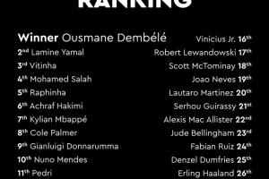 體育資訊09月23日訊 登貝萊奪得2025金球獎,隊報報道,周六《法國足球》雜志發(fā)布時將公布完整得分。