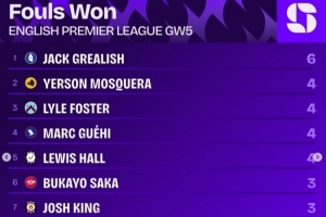 全文摘要:英超第5輪數(shù)據(jù)出爐,埃弗頓的格拉利什以6次造犯規(guī)高居榜首。狼隊的耶森-莫斯克拉等4名球員以4次并列次席,薩卡等5人則以3次位列第三。