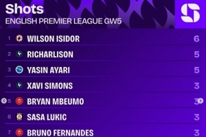 體育資訊9月24日訊 英超第5輪戰(zhàn)罷,squawkafootball列各項數據排行,桑德蘭前鋒伊西多是本輪射門次數最多的球員,共6次。