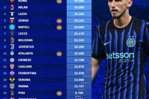 全文摘要:德轉(zhuǎn)盤點(diǎn)了意甲2025-26賽季季票銷售。國米與羅馬以4萬張并列榜首,AC米蘭以3.8萬張緊隨其后。尤文圖斯僅售1.92萬張,排名第九。多支球隊(duì)季票已售罄,顯示意甲俱樂部市場熱度不一。
