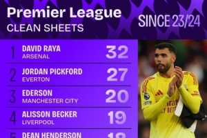 體育資訊9月25日訊 自2023-24賽季以來(lái)的英超門將零封榜出爐,阿森納門將拉亞以32場(chǎng)零封第一,皮克福德、埃德森分列二三。