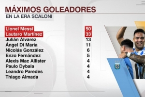 據(jù)ESPN統(tǒng)計,斯卡洛尼執(zhí)教以來,梅西打進50球阿根廷隊內最多,勞塔羅攻入33球第二多。