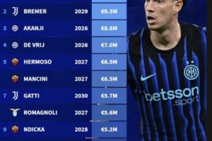 全文摘要:德國(guó)轉(zhuǎn)會(huì)市場(chǎng)公布意甲中衛(wèi)稅前薪資排行。國(guó)米后衛(wèi)巴斯托尼以1020萬(wàn)歐年薪高居榜首,尤文圖斯的布雷默以930萬(wàn)歐緊隨其后。國(guó)米新援阿坎吉以880萬(wàn)歐位列第三,國(guó)米共有四人上榜,包攬前四名中的三席。
