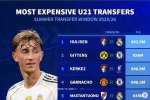 全文摘要:《轉(zhuǎn)會市場》公布今夏U21球員轉(zhuǎn)會費榜單,皇馬以6250萬歐元簽下赫伊森位居榜首。切爾西以5600萬歐元引進吉滕斯排名第二,利物浦以4690萬歐元簽下科爾克茲位列第三。榜單顯示,豪門俱樂部在年輕球員爭奪上投入巨大,英超球隊尤為活躍。