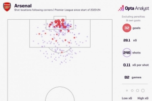 不包括烏龍球(因?yàn)闆](méi)有預(yù)期進(jìn)球值),阿森納在這段時(shí)間里預(yù)期進(jìn)球28.1的情況下攻入32球。僅看本賽季,阿森納在英超中主罰了45個(gè)角球,比任何其他球隊(duì)至少多4個(gè),其中賴斯主罰了24個(gè)。這些角球產(chǎn)生了18次射門,其中有6次轉(zhuǎn)化為進(jìn)球。這意味著阿森納在超過(guò)三分之一的角球進(jìn)攻中都能形成射門,并且有三分之一的射門能夠成功得分。