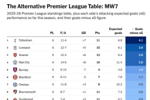 體育資訊10月2日訊 根據(jù)The Athletic統(tǒng)計,曼聯(lián)預(yù)期進球12.3個,實際進球7個,是英超實際進球與預(yù)期進球相差最大的球隊。