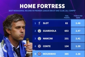 附英超執(zhí)教單一俱樂部主場(chǎng)場(chǎng)均得分榜(至少25場(chǎng)比賽):
