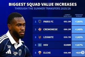 全文摘要:根據(jù)《轉(zhuǎn)會市場》統(tǒng)計(jì),多家升班馬俱樂部在今夏轉(zhuǎn)會窗后,因陣容升級導(dǎo)致總身價(jià)大幅飆升。其中,巴黎FC以195%的漲幅位居榜首,克雷莫內(nèi)塞、萊萬特和漢堡等球隊(duì)也憑借超過100%的驚人漲幅躋身榜單前列,展現(xiàn)了升班馬在轉(zhuǎn)會市場的強(qiáng)勁投入。