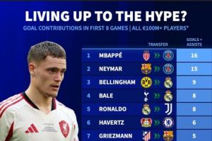 德轉(zhuǎn)“惡趣味”地統(tǒng)計了轉(zhuǎn)會費上億歐元的攻擊手們?yōu)樾虑蜿牫鰬?zhàn)前8場比賽,在進(jìn)球+助攻上的貢獻(xiàn)榜單。姆巴佩、內(nèi)馬爾、貝林厄姆分列前3,而最后一名可謂是為了這碟醋才包的這盤餃子...