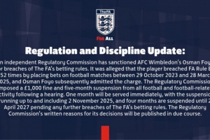獨立監(jiān)管委員會已對AFC溫布爾登球員奧斯曼-福約違反博彩條例的行為作出處罰。據(jù)指控,該球員在2023年10月29日至2025年3月28日期間對足球比賽進行投注,違反英足總E8條例252次。