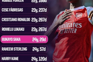 以下為英超歷史達成直接參與100球最年輕紀錄榜,薩卡位列第7。