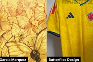 哥倫比亞世界杯主場球衣的獨(dú)特之處在于其蝴蝶圖案,以此向哥倫比亞作家馬爾克斯致敬,象征著希望、變革和愛的黃色蝴蝶在他的作品中頻繁出現(xiàn)。