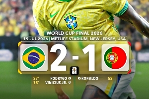 巴西2-1葡萄牙,羅德里戈先拔頭籌,C羅下半場(chǎng)扳平比分,維尼修斯制勝。