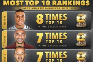 體育資訊10月07日訊 據(jù)外媒score90統(tǒng)計(jì),姆巴佩8次入圍金球獎(jiǎng)前十,但從未獲獎(jiǎng),歷史最多。
