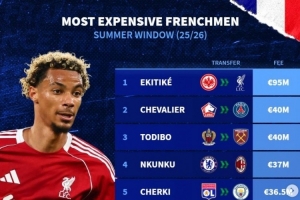全文摘要:《轉會市場》公布了今夏法國球員轉會費榜單。利物浦以9500萬歐元簽下?;倏宋痪影袷?。巴黎、西漢姆聯等隊也斥巨資引進法國球員,舍瓦利耶與托迪博均以4000萬歐元并列第二。這份榜單反映了歐洲豪門對法國青訓人才的青睞與激烈競爭。