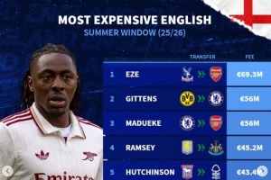 全文摘要:《轉會市場》公布了今夏英格蘭球員轉會費榜單。埃澤以6930萬歐元從水晶宮加盟阿森納,位居榜首。吉滕斯(5600萬)與馬杜埃凱(同為5600萬)分列二、三位。拉姆塞、哈欽森等球員也位列前十。阿森納成為今夏英格蘭球員轉會的最大贏家。