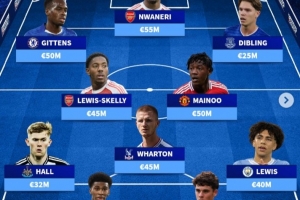 中場(chǎng):沃頓(水晶宮,4500萬歐)、劉易斯-斯凱利(阿森納,4500萬歐)、梅努(曼聯(lián),5000萬歐)