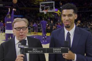 今日前NBA球員、現(xiàn)湖人電臺(tái)Spectrum SportsNet解說(shuō)員丹尼-格林現(xiàn)場(chǎng)解說(shuō)湖人VS勇士的季前賽。