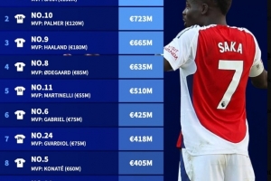 1、7號(hào):球員總身價(jià)7.71億歐元,薩卡1.5億歐最高