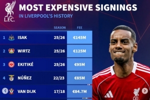體育資訊9月2日訊 利物浦壓哨簽下今夏標(biāo)王伊薩克,《轉(zhuǎn)會(huì)市場(chǎng)》也統(tǒng)計(jì)了紅軍隊(duì)史最貴買人情況,前三均為今夏新援。