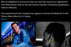 “我們非常高興地宣布,俱樂部已與曼城就巴西門將埃德森的永久轉(zhuǎn)會達(dá)成協(xié)議。這位經(jīng)驗(yàn)豐富的門將已與我們簽署了一份3+1合同?!?/p>
