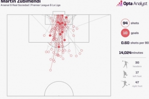據(jù)統(tǒng)計(jì),這是蘇維門迪在頂級(jí)聯(lián)賽生涯首次打進(jìn)禁區(qū)外的遠(yuǎn)射,他在為皇家社會(huì)和阿森納效力的比賽中94次射門打進(jìn)10球,但是首次打進(jìn)遠(yuǎn)射。