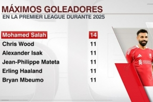 這是薩拉赫在2025年英超打進(jìn)的第14球,領(lǐng)跑所有球員,并列次席的伍德、伊薩克、馬特塔、哈蘭德以及姆伯莫均是打進(jìn)11球。