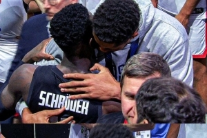 比賽賽后,同時(shí)入選最佳陣容的字母哥和施羅德?lián)肀е乱?。對此,施羅德表示:“揚(yáng)尼斯做出了非常棒的舉動(dòng),他主動(dòng)來找我,說我們各自代表德國和希臘為國征戰(zhàn),而他這次也終于為希臘隊(duì)贏得了首枚大賽獎(jiǎng)牌。我對他只有敬佩——他有四個(gè)可愛的孩子、賢惠的妻子,還有始終陪伴他的兄弟,一家人都在為籃球事業(yè)努力。更不用說他在NBA賽場上的表現(xiàn),那完全是另一個(gè)級別的存在,絕對是世界頂尖球員之一。他主動(dòng)過來和我交流,這種舉動(dòng)充滿了體育精神,非常難得。他還說一直在看我們球隊(duì)的YouTube視頻,我覺得這種跨國家的球員互動(dòng),對希臘和德國的籃球交流也很有意義?!?/p>