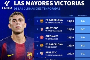 體育資訊9月15日訊 西甲第4輪比賽,巴薩在主場(chǎng)以6-0的比分大勝瓦倫西亞。今年1月,紅藍(lán)軍團(tuán)曾以7-1的比分大勝同樣的對(duì)手。德國(guó)轉(zhuǎn)會(huì)市場(chǎng)盤(pán)點(diǎn)了西甲最大比分贏球top10,巴薩5次上榜。