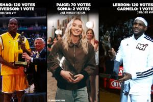 1999-2000賽季MVP,奧尼爾收獲了121張選票中的120張選票,艾弗森獲得另外一張MVP選票