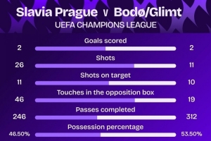 此役布拉格斯拉維亞射正11次,博德閃耀射正10次。據(jù)Squawka統(tǒng)計(jì),這是近10個(gè)賽季第3場雙方都射正10+的歐冠比賽,前2場為2017年萊比錫vs貝西克塔斯、2020年薩爾茨堡vs拜仁。