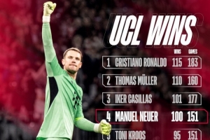 全文摘要:拜仁歐冠3-1勝切爾西,門(mén)將諾伊爾以100勝成為歷史第4位達(dá)成此成就的球員。官方公布?xì)W冠勝場(chǎng)榜,C羅以115勝居首,穆勒110勝第二,卡西利亞斯101勝第三,諾伊爾100勝第四,克羅斯與梅西并列95勝第五。