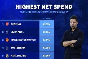 體育資訊9月4日訊 德國(guó)轉(zhuǎn)會(huì)市場(chǎng)統(tǒng)計(jì)了今夏各隊(duì)轉(zhuǎn)會(huì)凈支出,并列出榜單,阿森納2.83億歐居首。